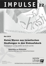 Einen Verzicht auf den Kauf von Siedlungsprodukten empfiehlt die pax christi-Nahostkommission allen Verbraucherinnen und Verbrauchern, denen die Achtung geltender Menschen- und Völkerrechtsstandards im israelisch-palästinensischen Konflikt wichtig ist. Damit jeder und jede Einzelne eine informierte Entscheidung treffen kann, hat die Kommission auf dem Ökumenischen Kirchentag in München (Mai 2010) eine Materialsammlung mit aktuellen Rechtsgrundlagen zur Frage des Kaufverzichts vorgestellt: „Keine Waren aus israelischen Siedlungen in den Einkaufskorb: Konsequenzen aus den Urteilen des EuGH und IGH“ (= pax christi Impulse 22).