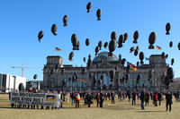 Mit 100 Ballons und mehr als doppelt so viel Friedensaktivisten setzte das Kampagnenbündnis den Protest gegen deutsche Rüstungsexporte gekonnt und erfolgreich ins Bild.