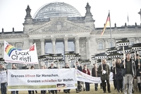 „Es ist ein Skandal, das Armuts- und Kriegsflüchtlingen kaum eine Chance haben, in Deutschland und Europa eine sichere Zuflucht zu finden, gleichzeitig aber dem Rüstungsexport weiterhin Tür und Tor geöffnet wird,“ kritisiert Christine Hoffmann, pax christi-Generalsekretärin und Sprecherin der „Aktion Aufschrei Stoppt den Waffenhandel!“ die Bundesregierung. „Wer Frieden und Menschenrechte will, der muss den Worten Taten folgen lassen und sich in der EU dafür einsetzen, dass die Grenzen für die Menschen geöffnet und die Grenzen für Waffen geschlossen werden“, forderte Hoffmann vor dem Reichstag die Bundesregierung auf.